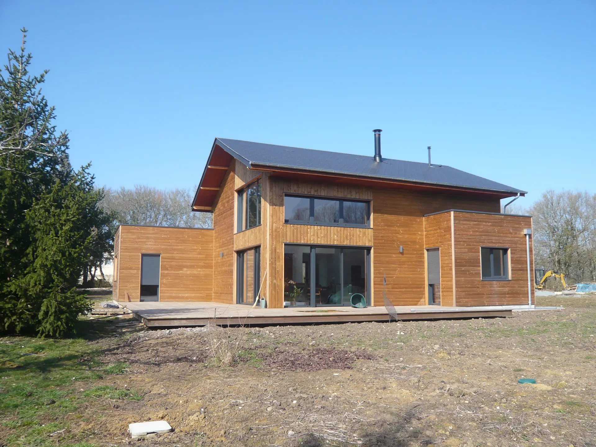La structure bois, associée à une isolation thermique renforcée, limite les ponts thermiques et régule naturellement la température intérieure. Hiver comme été, votre maison reste agréable à vivre. Le bardage bois en façade complète ce dispositif en assurant une protection durable contre les intempéries.
