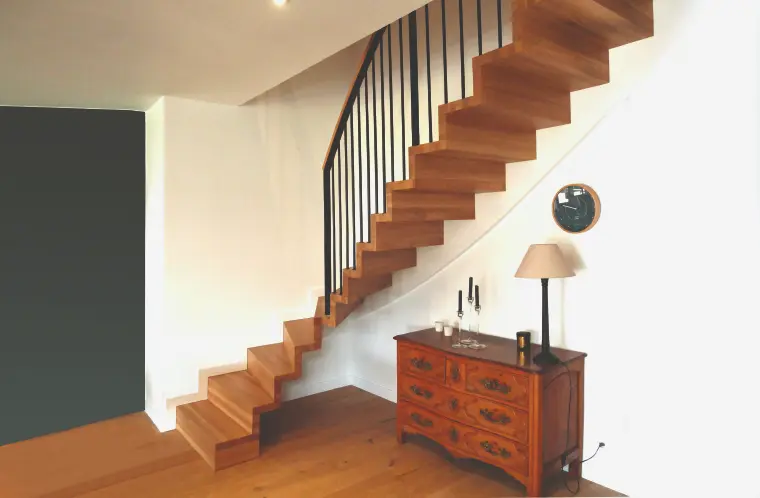 Grâce à notre partenariat avec Treppenmeister, nous vous proposons un large choix de modèles : escalier droit, escalier quart tournant ou escalier hélicoïdal. Chaque escalier est personnalisé selon vos besoins : choix des matériaux (bois massif, métal, verre), coloris des marches, style de rampe et type de garde-corps.
